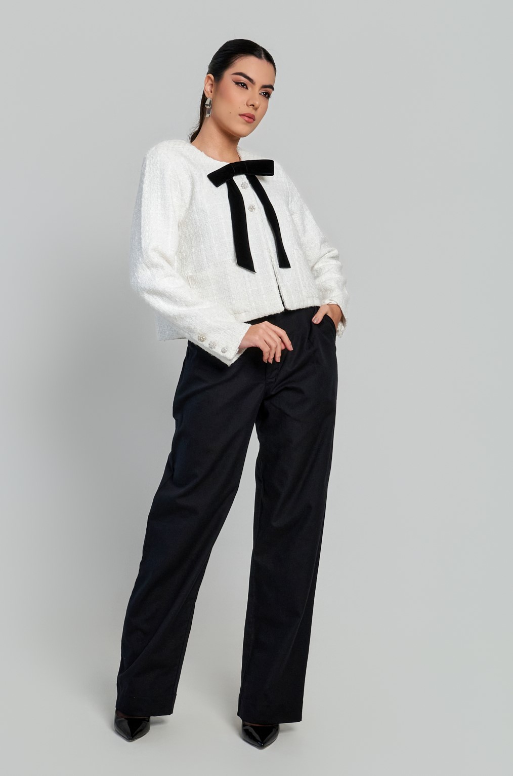 Calça confeccionada em algodão com modelagem reta. Possui pregas frontais, fechamento com zíper e bolsos faca.