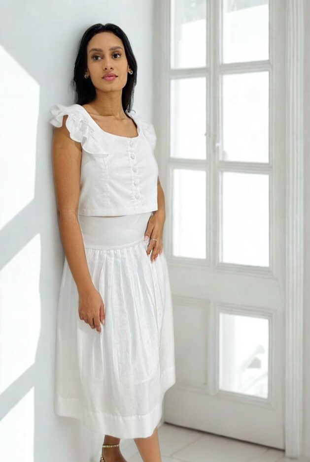O conjunto é jovial, com estilo romântico e delicado. Pode ser usado em diversas ocasições com as peças juntas ou separadas. Fica bem com salto, sapatilha ou sandália.