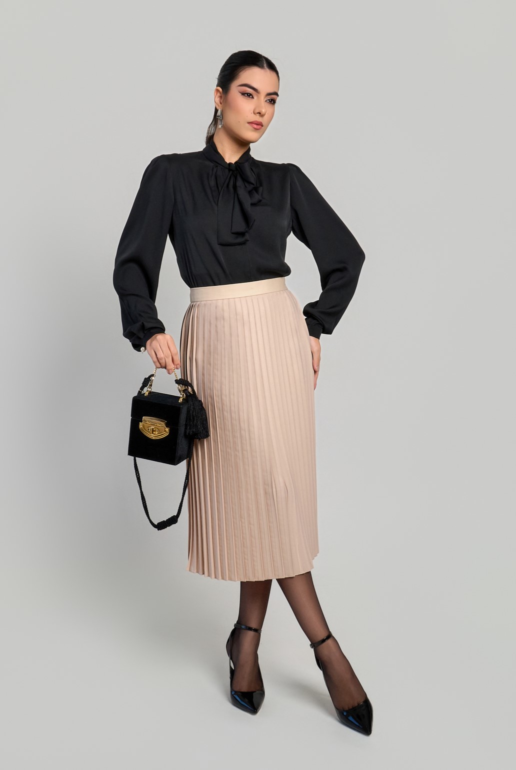 Saia midi plissada em modelagem de alfaiataria reta com excelente caimento. É uma peça elegante, atemporal e sofisticada que pode ser usada em diferentes ocasiões.